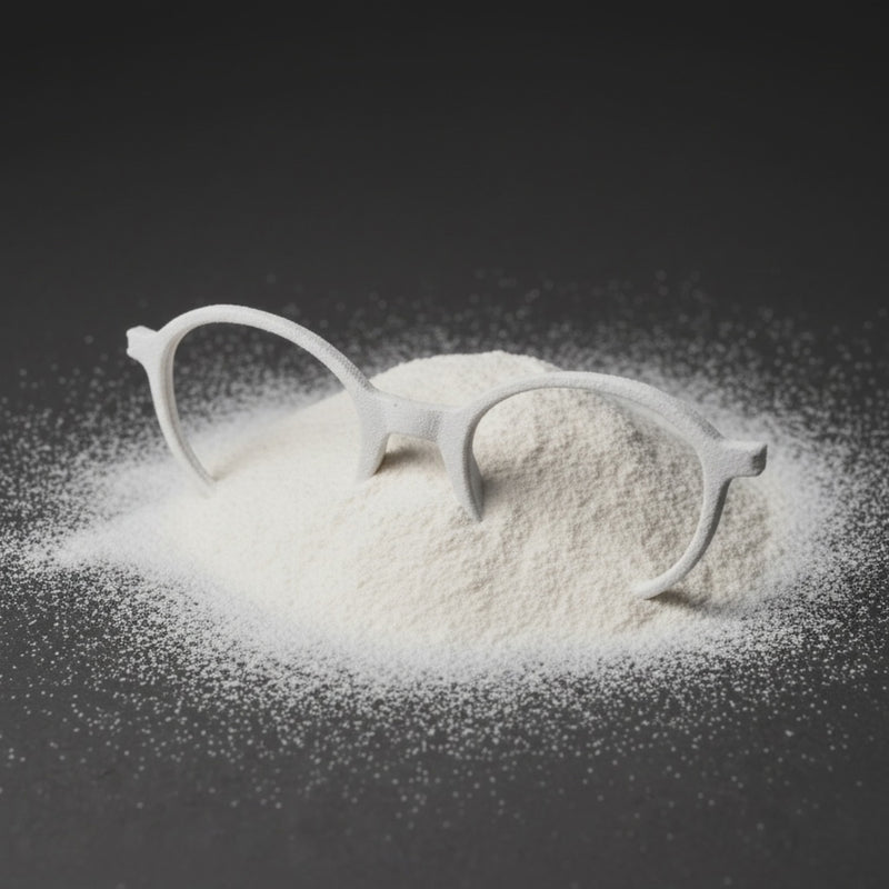 Onze monturen worden 3D-geprint in PA11, een biobased materiaal uit castorbonen. In de poederkamer ontstaat elke bril laag voor laag. We gebruiken alleen wat nodig is — bijna geen afval, maximale nauwkeurigheid.